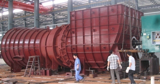 动叶可调轴流引风机 主要功能: 引风机是将来自锅炉的烟气经除尘后引出,并排入烟囱。 增压风机将来自引风机的烟气经增压后送入脱硫塔,并排入烟囱。 动叶可调轴流式引风机和脱硫增压风机一般为单级叶轮,如贵工程的引风机与脱 硫或脱硝增压风机合为一体,则引风机为双级叶轮,风机布置型式为卧式。风机叶片安装角可在静止状态或运行状态时用电动执行器通过一套液压调节装置进行调节。叶轮由一个整体式轴承箱支承。主轴承由轴承箱内的油池和液压润滑联合油站供油润滑。为了使风机的振动不传递至进气和排气管路,风机机壳两端设置了挠性联接件(围带),风机的进气箱的进口和扩压器的出口分别设置了进、排气膨胀节。电动机和风机用二个刚挠性半联轴器和一个中间轴相连接。风机的旋转方向为顺气流方向看逆时针。 风机的主要部件有:转子、中间轴和联轴器、供油装置、测量仪表、钢结构件、钢结构连接件、挠性连接和隔声装置等。