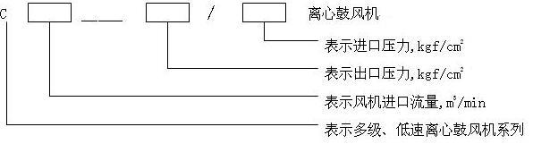 例:C470-2.26/0.94 离心鼓风机 表示离心鼓风机属多级、低速C系列,风机进口流量每分钟470立方米,进口压力为0.094Mpa,出口压力为0.226Mpa. 设计制造及试验标准: